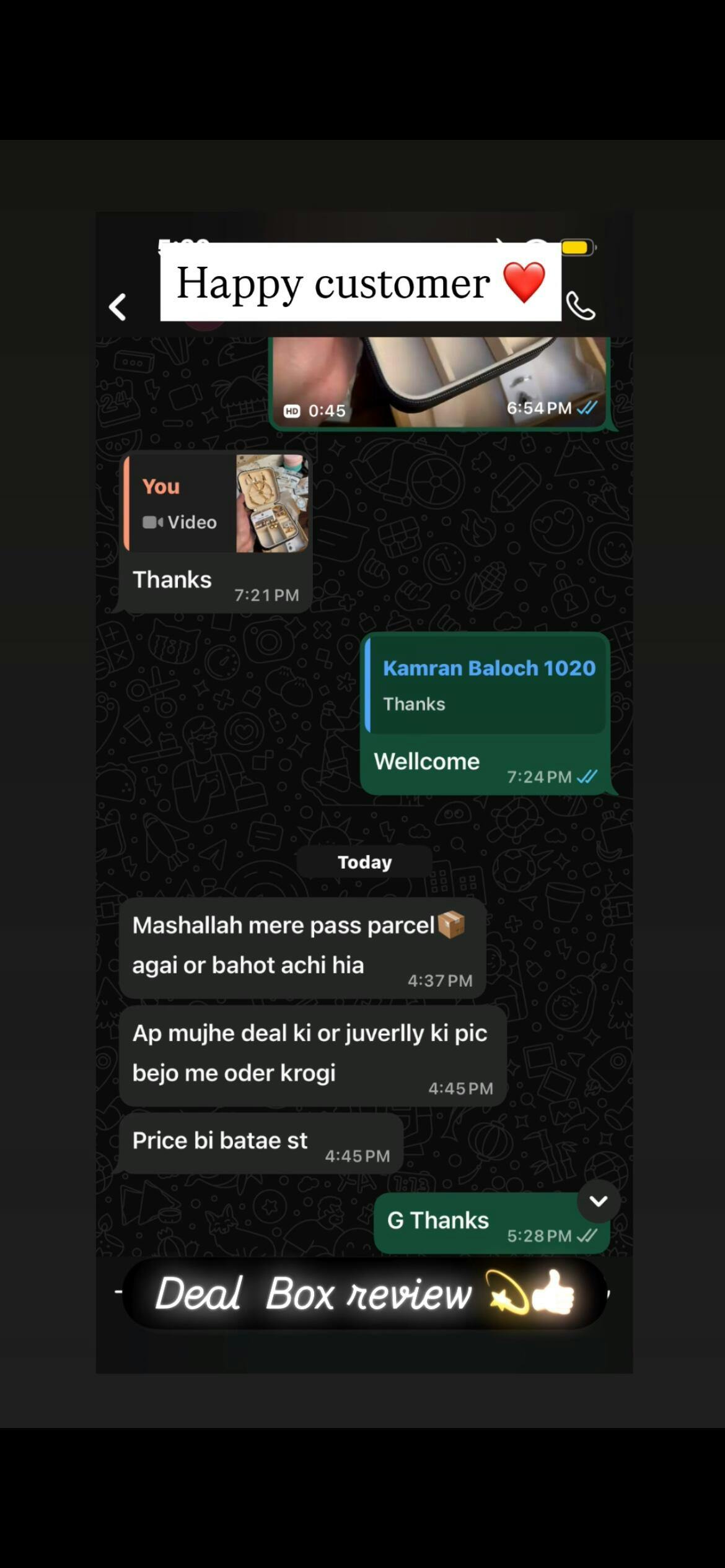 Bhi achi deal box hay markeet man jo or log sale kar rhy watch wali deals wo fazool hay good experience jo dekhya wahi sub bhja hay inho nay i m satisfied from naya andaaz jewelry 👍🏻 highly recommend