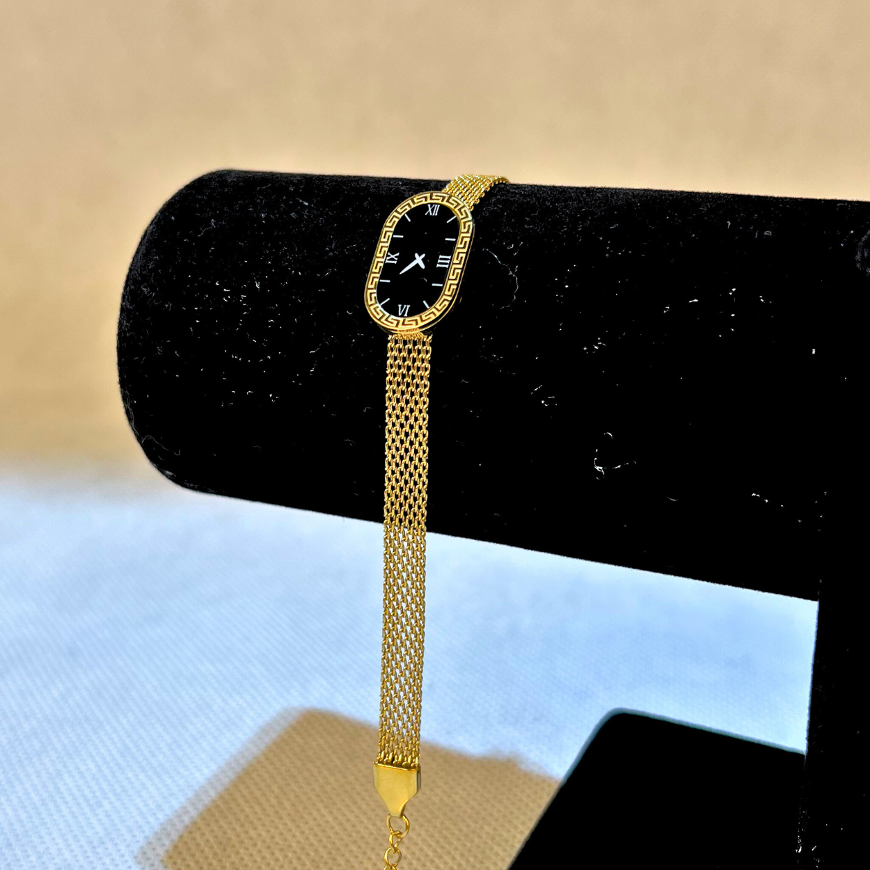 Zaroor! Yeh product bohat hi unique aur classy hai. Yeh ek "Watch Style Bracelet" hai, jo dikhne mein ghari (watch) jaisa lagta hai lekin hai ek nazuk bracelet. Iska "Greek Key" border (jo Versace style jaisa hai) aur black dial isay "Old Money Aesthetic" aur vintage look deta hai.